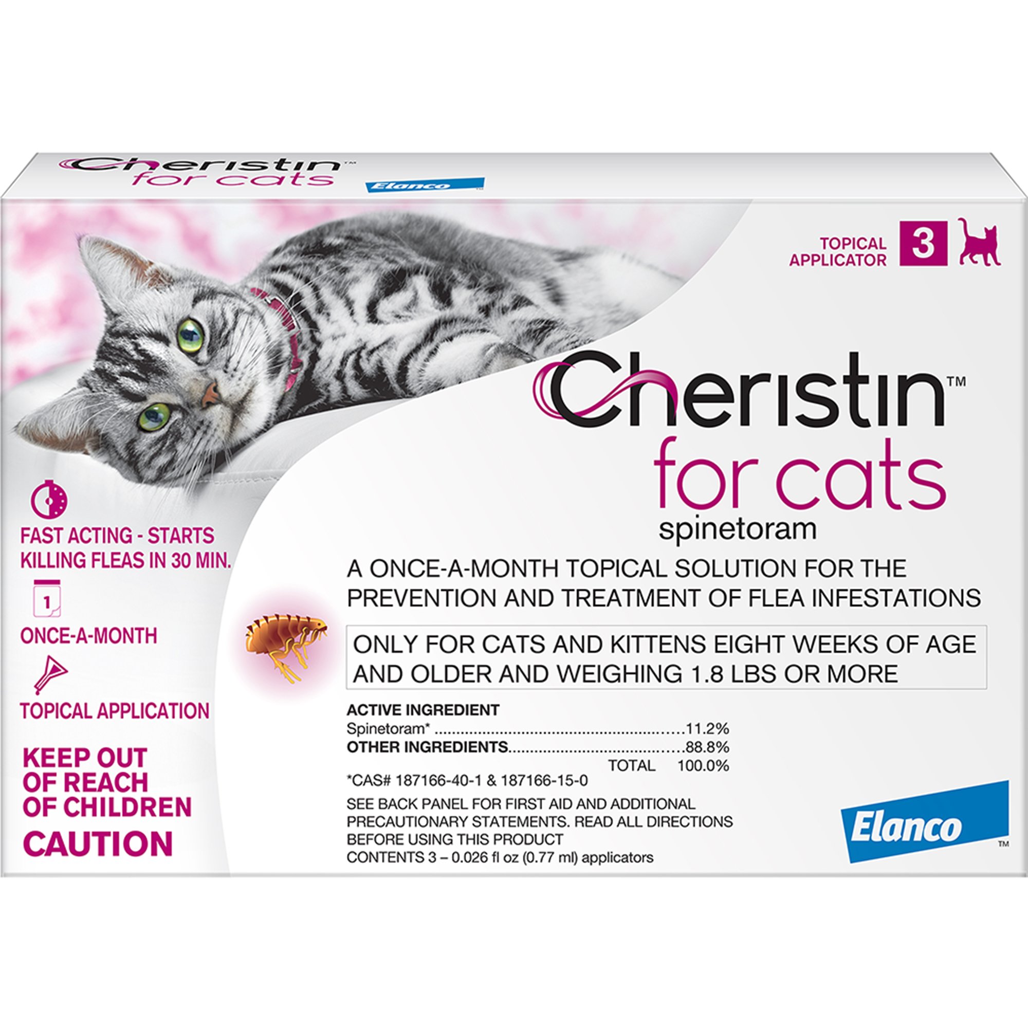 Up to 4 cash back Cheristin comes in one dose size for all cats and kittens 18 lbs and greater or 8 weeks of age and older making it great for families with multiple cats. Two for registration Studies 1 and 2 and one comparing residual speed of kill SOK with topically applied fipronilS-methoprene FSM and imidacloprid Study 3. Cheristin is a fast acting and it starts to kill fleas within half an hour.